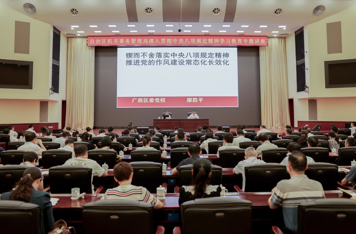 4月23日,自治區(qū)機(jī)關(guān)事務(wù)管理局舉辦深入貫徹中央八項規(guī)定精神學(xué)習(xí)教育專題講座,邀請中共廣西區(qū)委黨校黨史黨建教研部主任、教授廖勝平博士作專題授課。自治區(qū)機(jī)關(guān)事務(wù)管理局在家的局黨組成員,駐局紀(jì)檢監(jiān)察組全體成員,局機(jī)關(guān)全體干部職工、各直屬單位科級以上干部及重點(diǎn)崗位人員,局屬幼兒園、企業(yè)中層以上管理人員,局學(xué)習(xí)教育工作專班全體人員共280人參加講座。