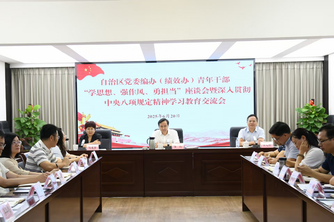 6月20日,自治區(qū)黨委編辦(績效辦)召開年輕干部“學(xué)思想、強(qiáng)作風(fēng)、勇?lián)?dāng)”座談會(huì)暨深入貫徹中央八項(xiàng)規(guī)定精神學(xué)習(xí)教育交流會(huì),大力弘揚(yáng)以學(xué)為先的優(yōu)良學(xué)風(fēng),持續(xù)樹牢“實(shí)干為要、創(chuàng)新為魂,用業(yè)績說話、讓人民評(píng)價(jià)”的鮮明導(dǎo)向,推動(dòng)年輕干部把自覺加強(qiáng)學(xué)習(xí)作為一種精神追求和思想境界,努力做黨的創(chuàng)新理論的忠實(shí)實(shí)踐者和堅(jiān)定信仰者,以優(yōu)良作風(fēng)展現(xiàn)新?lián)?dāng)、新作為。自治區(qū)黨委編辦(績效辦)主任、自治區(qū)黨委組織部副部長(兼)曾凱出席會(huì)議并講話。