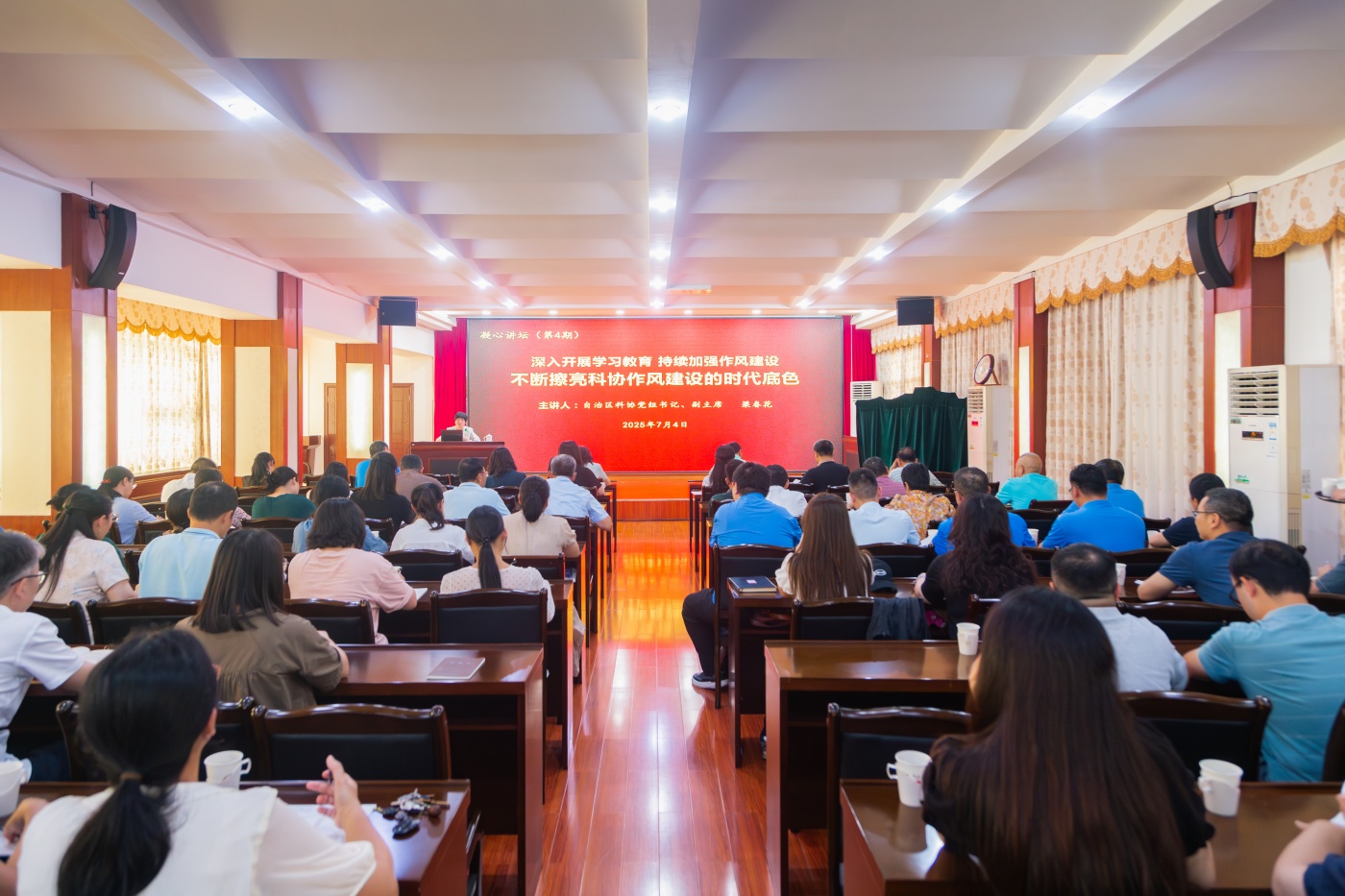7月4日,自治區(qū)科協(xié)組織舉辦“凝心講壇”(第4期)深入貫徹中央八項(xiàng)規(guī)定精神學(xué)習(xí)教育專題黨課活動。自治區(qū)科協(xié)黨組書記、副主席梁春花以《深入開展學(xué)習(xí)教育 持續(xù)加強(qiáng)作風(fēng)建設(shè),不斷擦亮科協(xié)作風(fēng)建設(shè)的時代底色》為題講授專題黨課,引導(dǎo)全體黨員干部深刻把握中央八項(xiàng)規(guī)定精神實(shí)質(zhì),爭做優(yōu)良作風(fēng)的傳承者、踐行者、維護(hù)者,以優(yōu)良作風(fēng)凝聚科技力量,全力服務(wù)國家創(chuàng)新驅(qū)動發(fā)展戰(zhàn)略和新時代壯美廣西建設(shè)發(fā)展大局。
