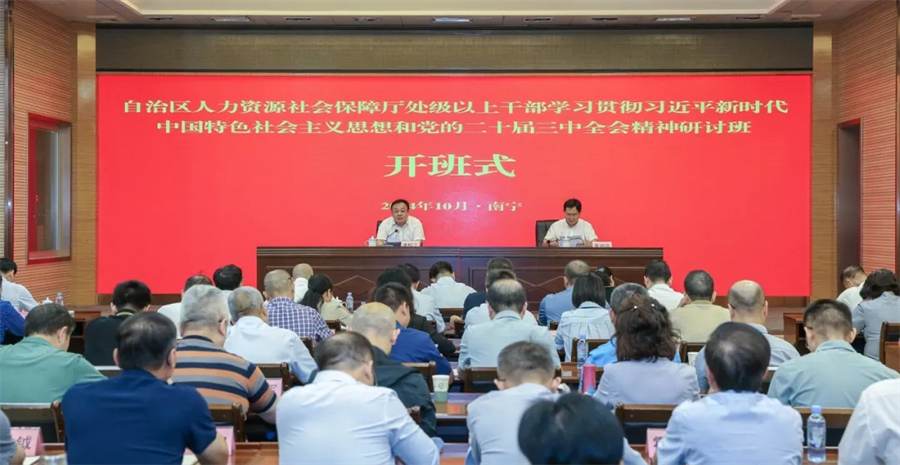10月9日,自治區(qū)人力資源社會保障廳處級以上干部學習貫徹習近平新時代中國特色社會主義思想和黨的二十屆三中全會精神研討班在南寧開班。研討班旨在深入學習貫徹習近平新時代中國特色社會主義思想和黨的二十屆三中全會精神,深刻領悟習近平總書記關于全面深化改革的一系列新思想、新觀點、新論斷,進一步深入領會黨的二十屆三中全會精神實質,推動各項改革任務在人社系統(tǒng)落地生根、開花結果,為譜寫中國式現(xiàn)代化廣西篇章貢獻人社力量。自治區(qū)人力資源社會保障廳黨組書記、廳長唐標文出席開班式并講話,廳黨組副書記、副廳長袁國華主持開班式。