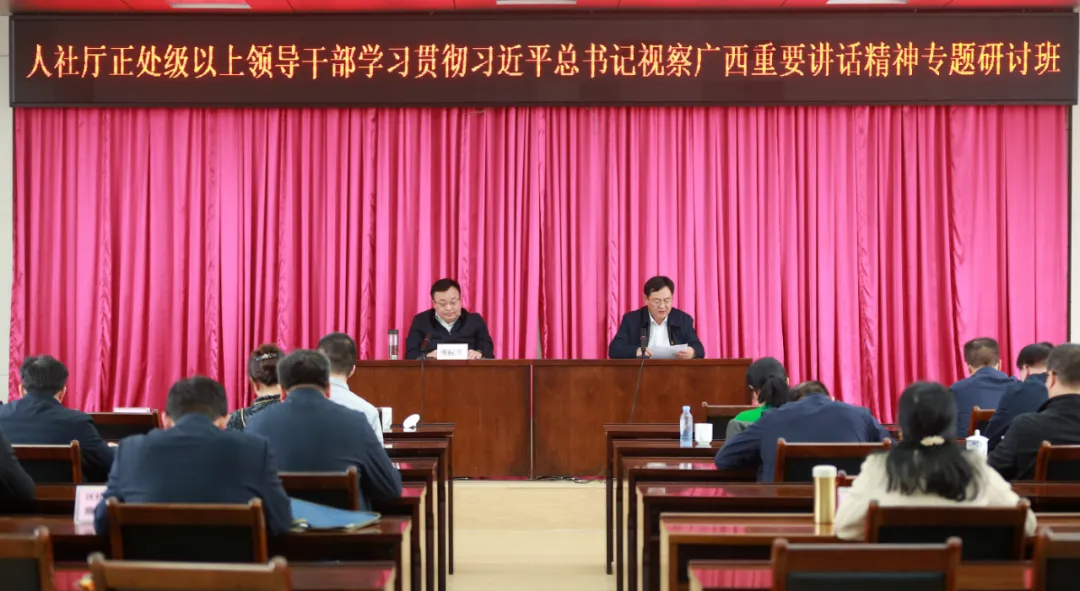 1月17日,自治區(qū)人力資源社會保障廳舉辦正處級以上領(lǐng)導(dǎo)干部學(xué)習(xí)貫徹習(xí)近平總書記視察廣西重要講話精神專題研討班,深入學(xué)習(xí)貫徹習(xí)近平總書記對廣西重大方略要求特別是習(xí)近平總書記視察廣西重要講話精神。研討班采取專題授課與集中研討相結(jié)合的形式開展,廳黨組書記、廳長唐標(biāo)文作動員部署講話,廳黨組副書記、副廳長袁國華主持研討班。