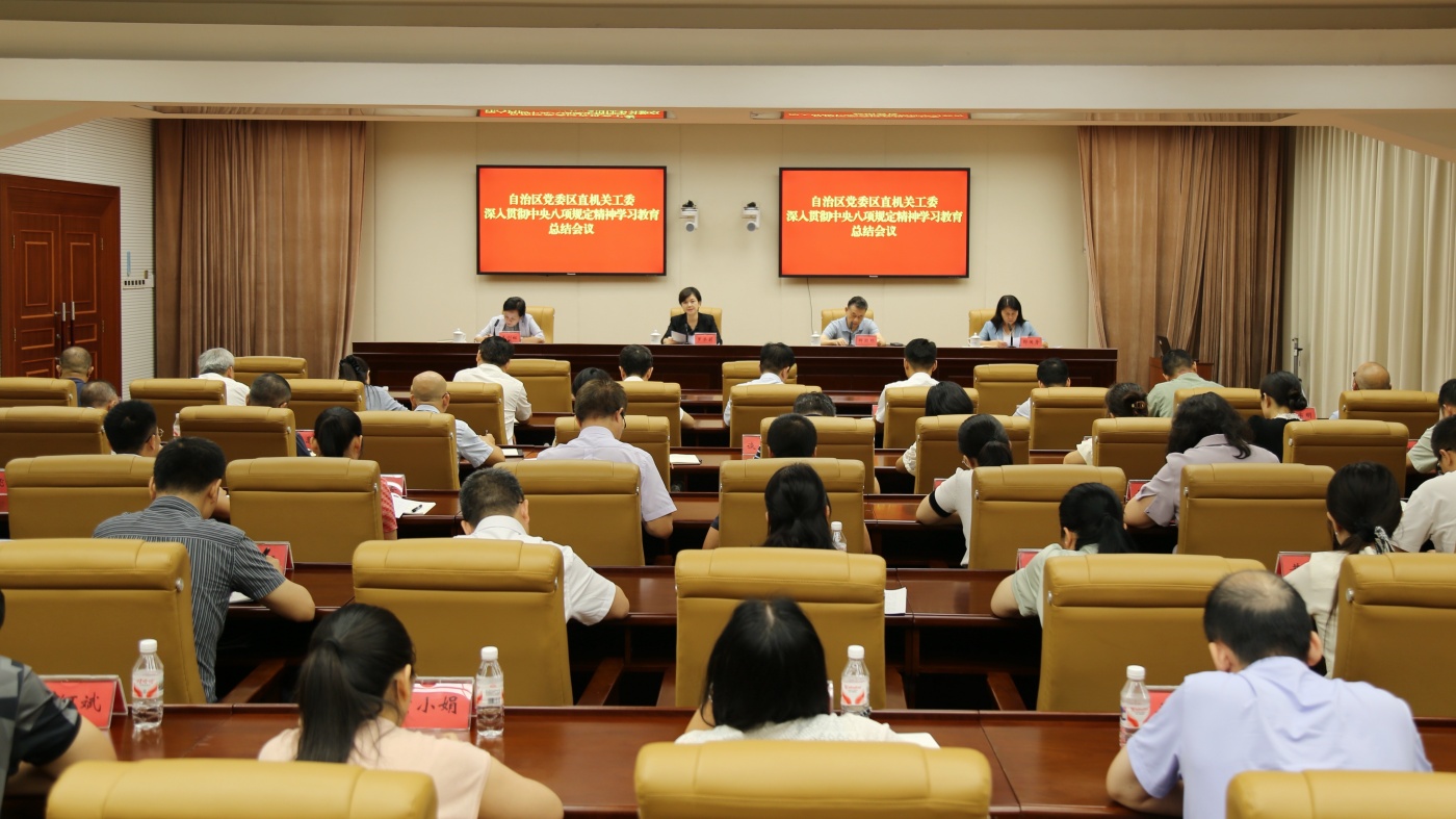 9月15日,自治區(qū)黨委區(qū)直機(jī)關(guān)工委召開(kāi)深入貫徹中央八項(xiàng)規(guī)定精神學(xué)習(xí)教育總結(jié)會(huì)議,傳達(dá)學(xué)習(xí)習(xí)近平總書(shū)記關(guān)于深入貫徹中央八項(xiàng)規(guī)定精神學(xué)習(xí)教育的重要指示精神,傳達(dá)學(xué)習(xí)中央、自治區(qū)黨委黨的建設(shè)工作領(lǐng)導(dǎo)小組會(huì)議精神,總結(jié)工委學(xué)習(xí)教育開(kāi)展情況,研究部署推進(jìn)作風(fēng)建設(shè)常態(tài)化長(zhǎng)效化工作。工委分管日常工作的副書(shū)記羅榮莉主持會(huì)議并講話,工委副書(shū)記鄒穎明,區(qū)直機(jī)關(guān)紀(jì)檢監(jiān)察工委書(shū)記、工委委員姜?jiǎng)纾の瘷C(jī)關(guān)黨委專(zhuān)職副書(shū)記、二級(jí)巡視員邵國(guó)芳出席。