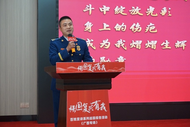 “我的手以后還能繼續(xù)工作嗎?”這是團(tuán)中央青年講師團(tuán)講師、柳州市柳東新區(qū)陽(yáng)和消防救援站站長(zhǎng)何博在一次出警救援中燒傷、強(qiáng)忍劇痛被送上手術(shù)臺(tái)后問的第一句話。因救援現(xiàn)場(chǎng)發(fā)生了爆燃,導(dǎo)致何博身體60%的面積燒傷,在他入院治療的100多天里,經(jīng)歷了休克、被告知要截肢、幾十次植皮手術(shù)、隔一天換一次藥的“鏖戰(zhàn)”,最終戰(zhàn)勝死神挺了過來。由于疤痕增生,何博的雙手、雙臂嚴(yán)重變形,導(dǎo)致生活完全不能自理,但他憑借一定會(huì)戰(zhàn)勝自我回到一線的強(qiáng)大意志力,經(jīng)過漫長(zhǎng)的術(shù)后康復(fù)訓(xùn)練,重新回到了熱愛的工作崗位。何博結(jié)合18年奮戰(zhàn)在滅火救援一線的經(jīng)歷,讓青年切身感受到了青春在烈火中逆行,與死神較量的偉大,展現(xiàn)了與人民群眾休戚與共的消防戰(zhàn)士捍衛(wèi)一方百姓幸福安康的使命、對(duì)黨和人民的赤膽忠心。