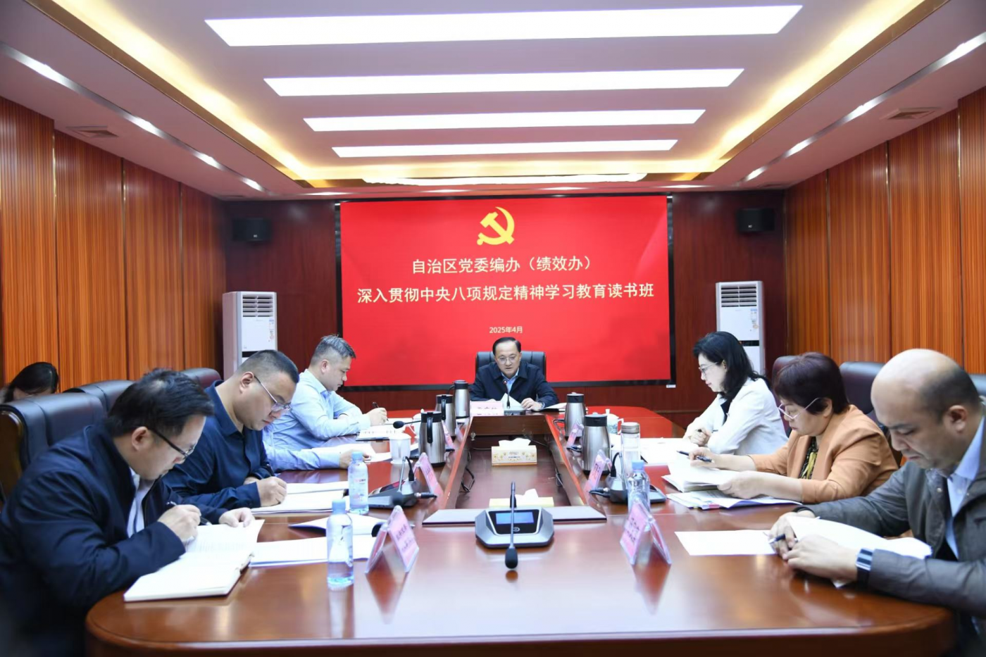 4月7日至8日,自治區(qū)黨委編辦(績效辦)舉辦深入貫徹中央八項規(guī)定精神學習教育讀書班,認真學習貫徹習近平總書記關(guān)于加強黨的作風建設(shè)的重要論述和中央八項規(guī)定及其實施細則精神。自治區(qū)黨委編辦(績效辦)主任、自治區(qū)黨委組織部副部長(兼)雷應(yīng)敏主持學習會并講話。
