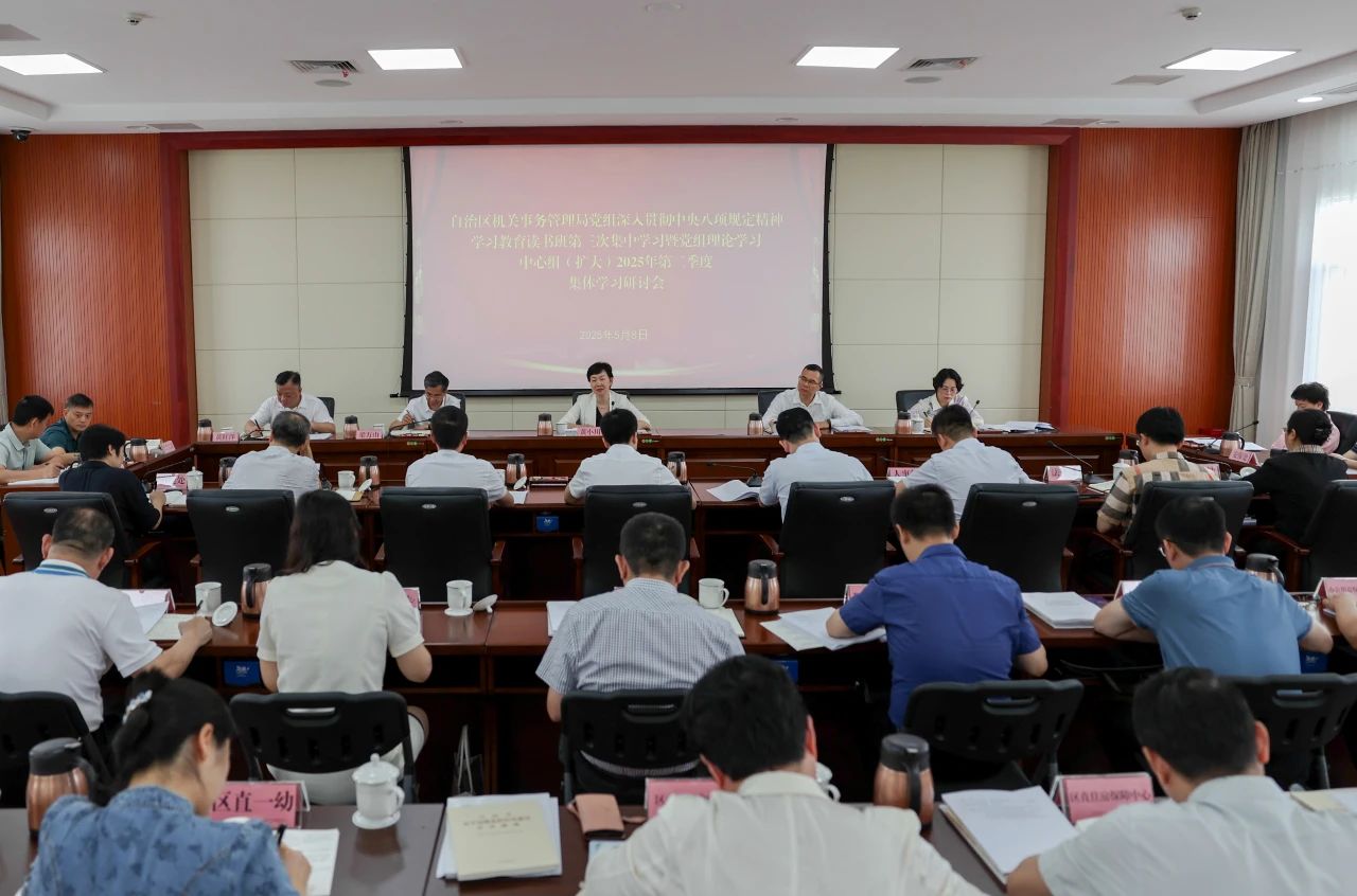 5月8日,自治區(qū)機關事務管理局黨組開展深入貫徹中央八項規(guī)定精神學習教育讀書班第三次集體學習暨黨組理論學習中心組(擴大)2025年第二季度集體學習研討,深入學習貫徹習近平總書記關于加強黨的作風建設的重要論述、關于深入貫徹中央八項規(guī)定精神學習教育的重要講話和重要指示精神,深入學習領會習近平經(jīng)濟思想以及習近平總書記關于全面深化改革的一系列新思想、新觀點、新論斷,并就《國家秘密定密管理規(guī)定》等有關內容作學習研討交流。自治區(qū)人民政府副秘書長,自治區(qū)機關事務管理局黨組書記、局長黃小川主持研討會并講話,局黨組成員、副局長黃譯萩和駐局紀檢監(jiān)察組組長、局黨組成員黃紅洋在會上進行領學并分別作研討交流發(fā)言,局黨組成員、副局長楊健豪、梁萬山參加學習研討。