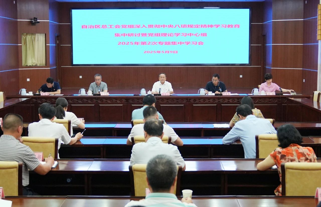 5月9日,自治區(qū)總工會黨組舉行深入貫徹中央八項規(guī)定精神學(xué)習(xí)教育集中研討暨黨組理論學(xué)習(xí)中心組2025年第2次專題集中學(xué)習(xí)會,深入學(xué)習(xí)貫徹習(xí)近平總書記關(guān)于加強(qiáng)黨的作風(fēng)建設(shè)的重要論述、關(guān)于深入貫徹中央八項規(guī)定精神學(xué)習(xí)教育的重要講話和重要指示精神,學(xué)習(xí)貫徹習(xí)近平總書記在慶祝中華全國總工會成立100周年暨全國勞動模范和先進(jìn)工作者表彰大會上的重要講話精神,推動學(xué)習(xí)教育走深走實。自治區(qū)總工會黨組書記、常務(wù)副主席(提名)韋永山主持并講話。