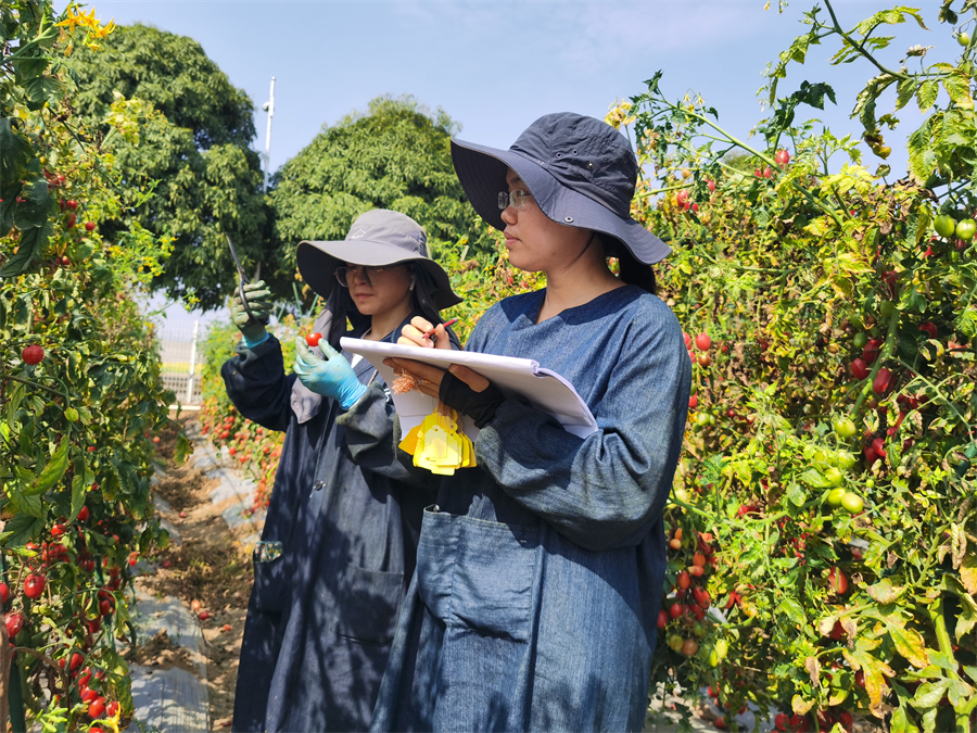 ▲廣西農(nóng)業(yè)科學(xué)院蔬菜研究所番茄茄子科研團(tuán)隊(duì)的科研隊(duì)員正在監(jiān)測(cè)番茄生產(chǎn)情況。