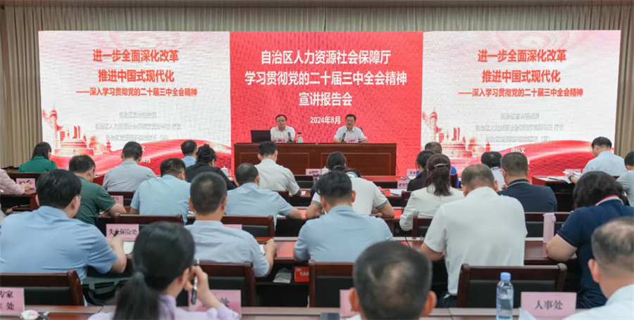 8月29日,自治區(qū)人力資源社會(huì)保障廳召開學(xué)習(xí)貫徹黨的二十屆三中全會(huì)精神宣講報(bào)告會(huì)。自治區(qū)宣講團(tuán)成員,廳黨組書記、廳長唐標(biāo)文作宣講報(bào)告。廳黨組副書記、副廳長袁國華主持報(bào)告會(huì)。