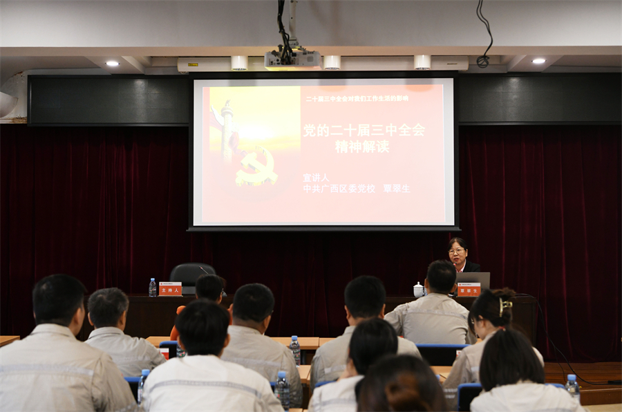 11月22日,區(qū)直機(jī)關(guān)學(xué)習(xí)貫徹黨的二十屆三中全會(huì)精神宣講報(bào)告會(huì)在廣西桂冠開投電力有限責(zé)任公司樂灘水電廠舉辦,自治區(qū)黨委講師團(tuán)特聘教授(專家)、區(qū)直機(jī)關(guān)宣講團(tuán)成員,自治區(qū)黨校原教授覃翠生作宣講報(bào)告,廣西桂冠開投電力有限責(zé)任公司黨委委員、紀(jì)委書記、工會(huì)主席劉瑋主持報(bào)告會(huì)。