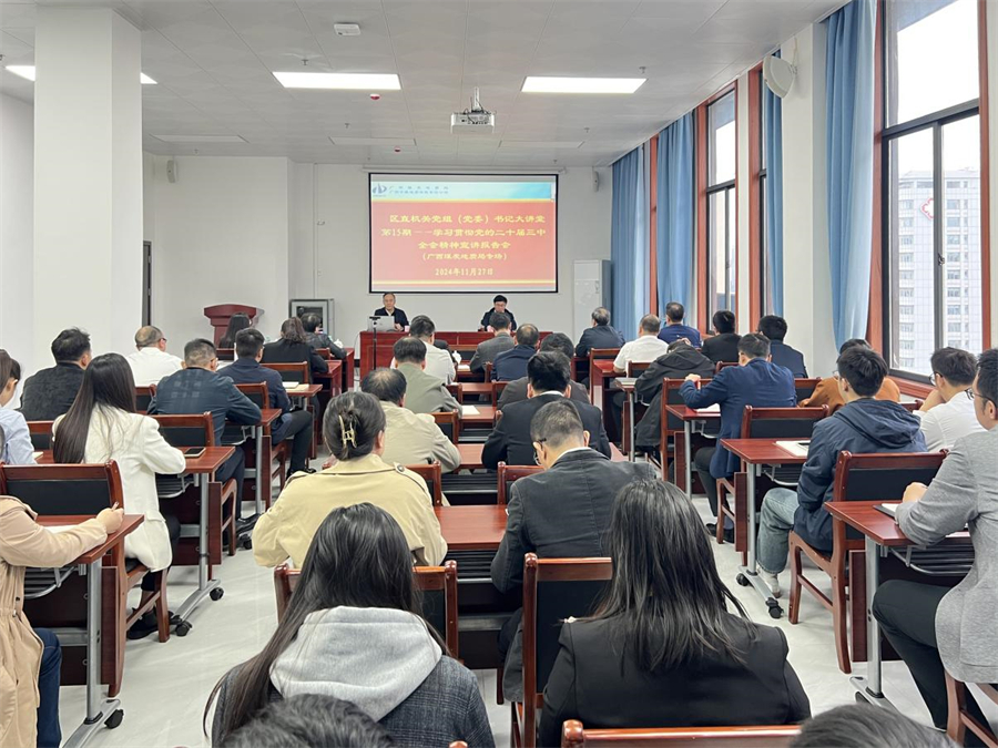 11月27日,區(qū)直機關(guān)黨組(黨委)書記大講堂第15期——學(xué)習(xí)貫徹黨的二十屆三中全會精神宣講在廣西煤炭地質(zhì)局舉辦,自治區(qū)黨委講師團特聘教授(專家)、廣西社會科學(xué)院黨組書記、院長陳立生作專題授課。廣西煤炭地質(zhì)局100余名干部職工通過“現(xiàn)場+視頻”的方式聆聽宣講。